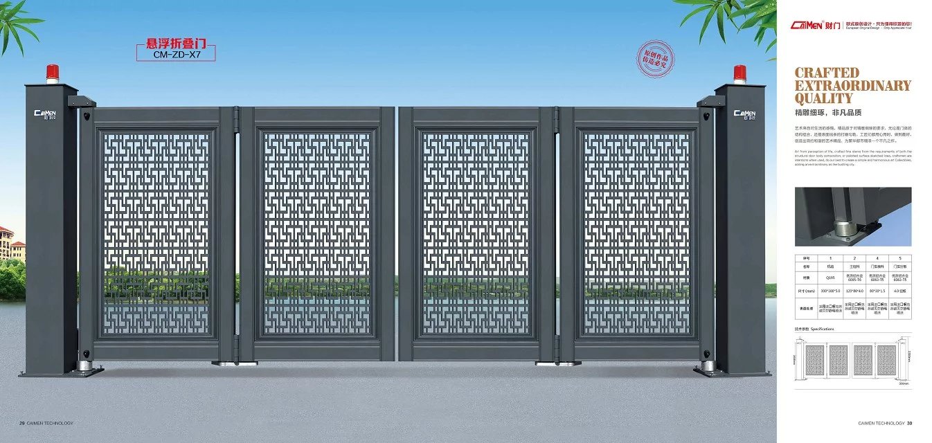 公司主要开发生产销售产品有:道闸、停车收费系统、景区票务系统、伸缩门、悬浮门、通道闸、广告道闸、智能监控安防设备、电子围栏、感应门总成、减速带(路障)、岗亭、旗杆、电动车库门、防盗门、电动铁艺门、各种锌钢喷塑围栏栏杆和开发集成各种建筑智能化系统等。全国销售24H热线:18215507821 悬浮折叠门三号